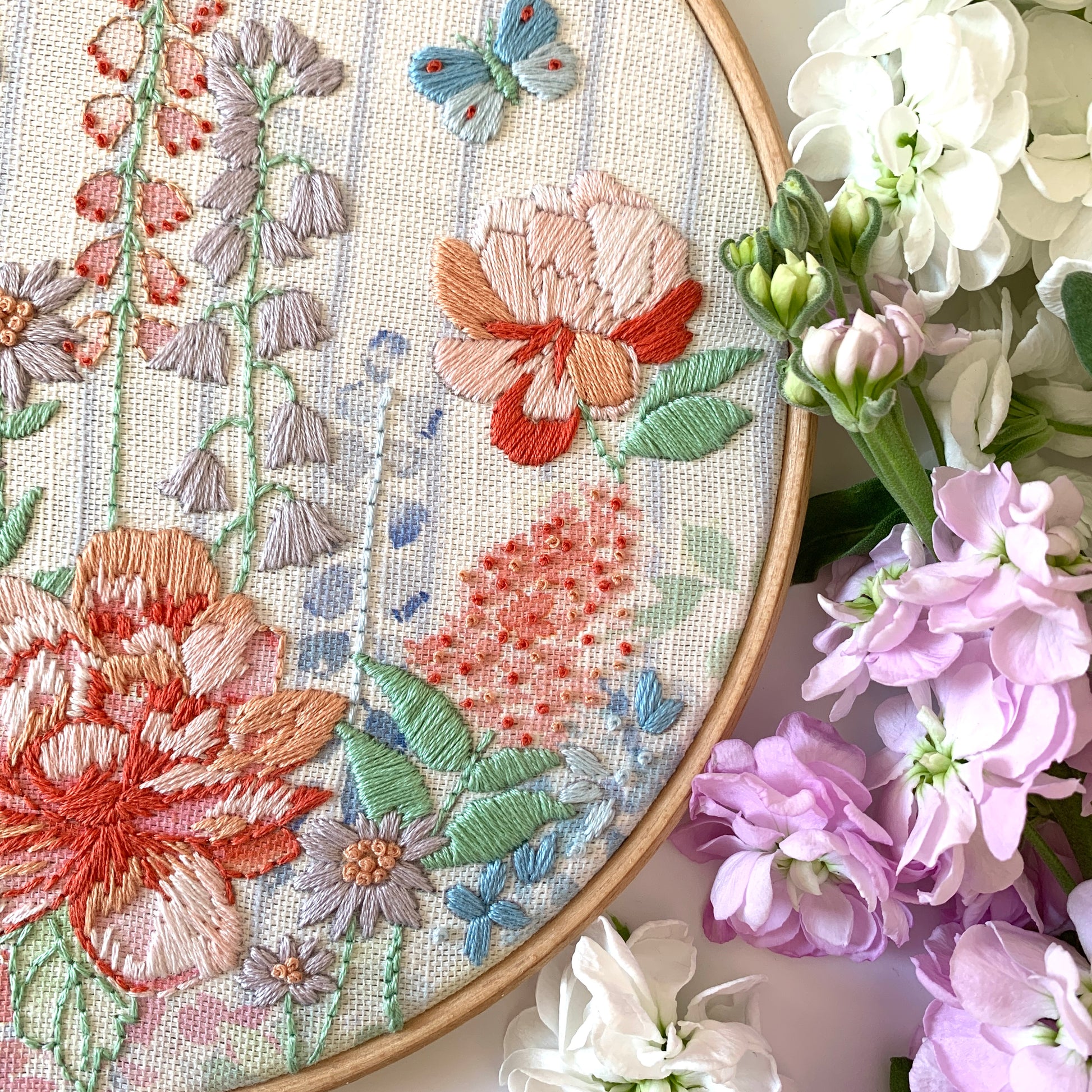 The kit comes with everything you need including full instructions, a helpful colour postcard, printed colour guide, 8 dmc embroidery threads, hand painted fabric fabric floral stripe design printed on cotton linen, 8” wooden embroidery hoop, and a needle.