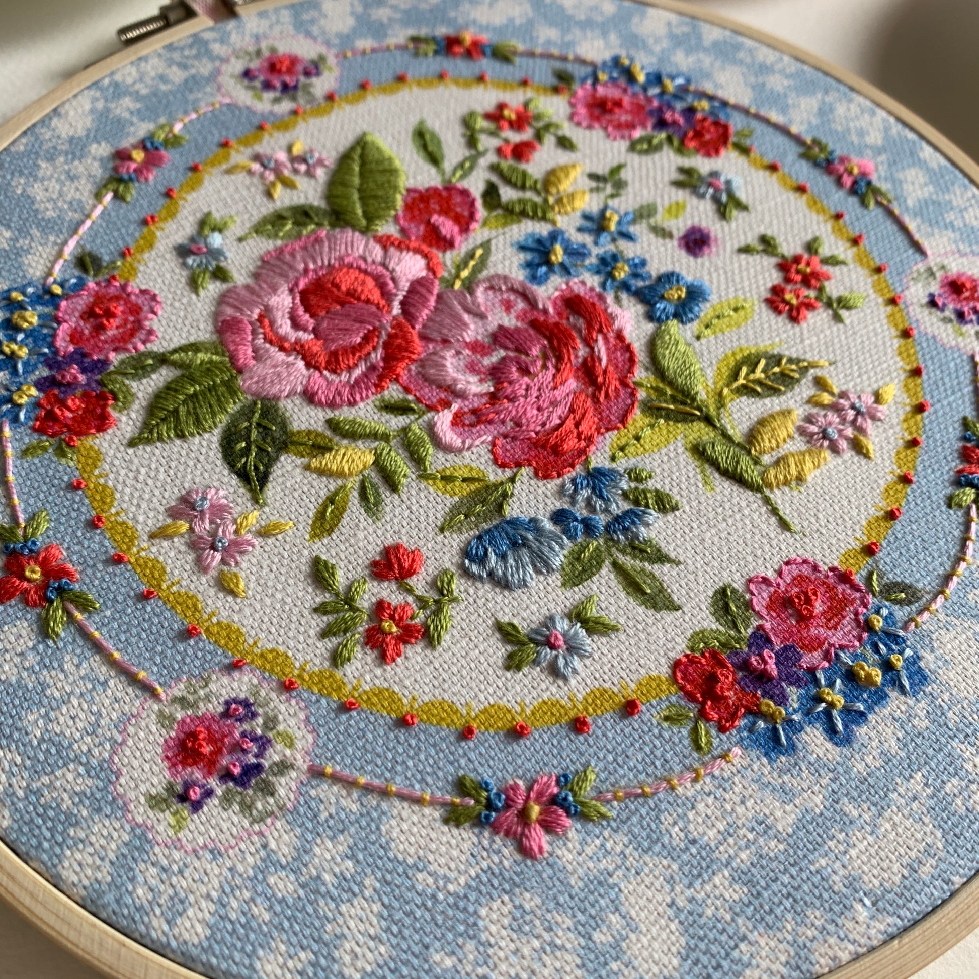 We’ve taken Davinder’s wonderful floral paintings to make the centre piece of this design using pink roses and surrounded by tiny miniature flowers both to be stitched and highlighted in dmc thread.
